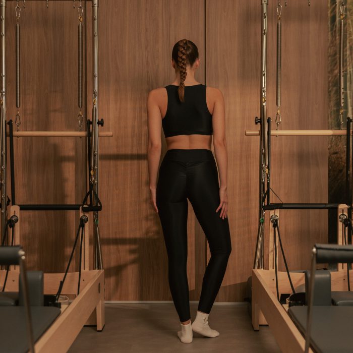 Хеланки за вежбање со висок струк во црна боја. Изработени се со детал на задниот дел кој дава визуелен ефект на обликување.
