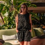 Женски сет од блуза и бермуди. Горниот дел е изработен со преклоп на задот.
