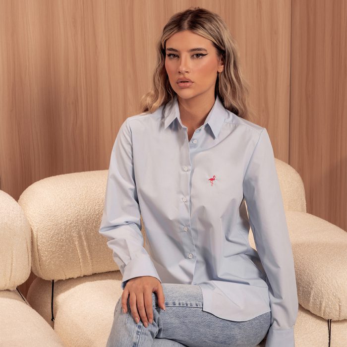 Женска кошула во светло сина боја, со розово лого.