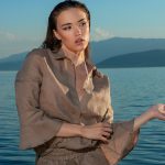 Ленена блуза во кафеава боја, со карнер на ракавите.