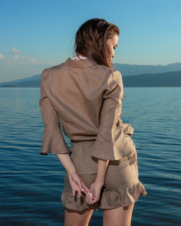 Ленен сет во кафеава боја, изработен со карнери на ракавите и бермудите.