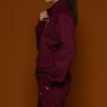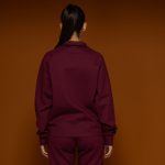 Горна женска тренерка во бордо боја, изработена со патент и декоративни џебови на предната страна.