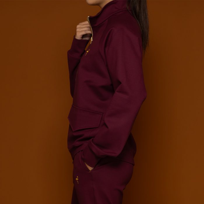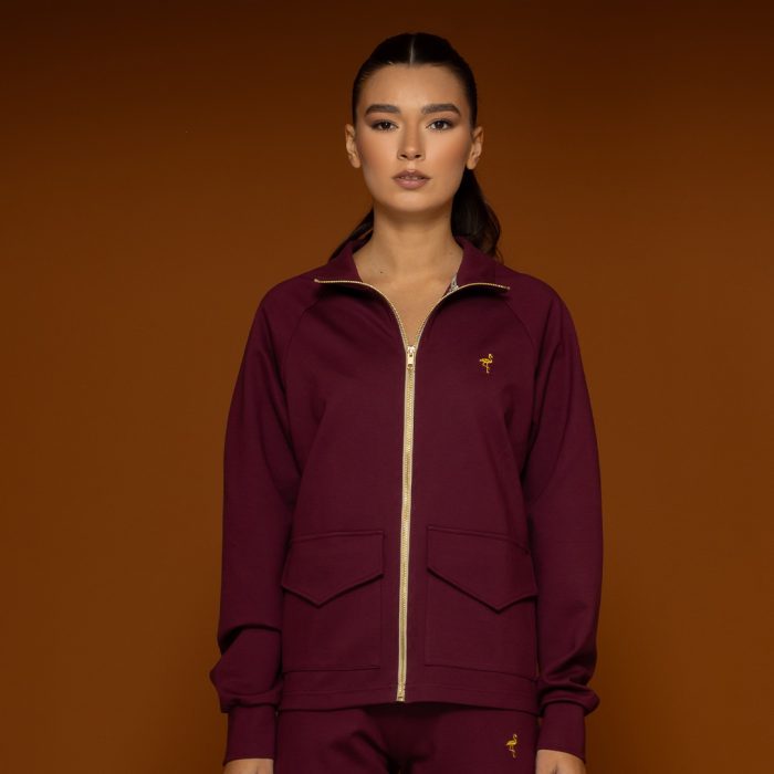 Горна женска тренерка во бордо боја, изработена со патент и декоративни џебови на предната страна.