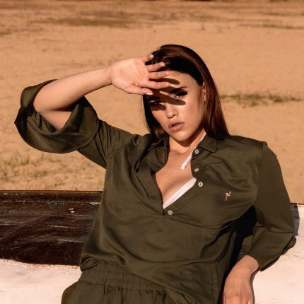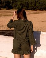 Ленена кошула во темно маслинеста боја, изработена со карнери на ракавите.