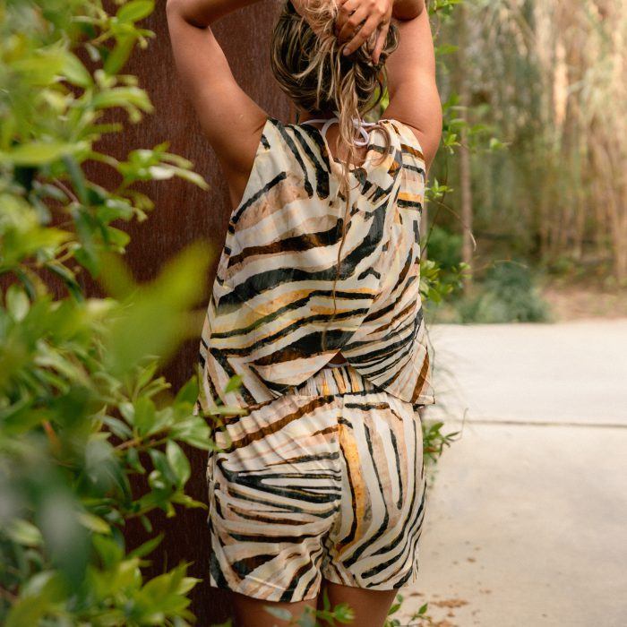 Женски сет од блуза и бермуди. Горниот дел е изработен со преклоп на задот.