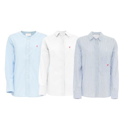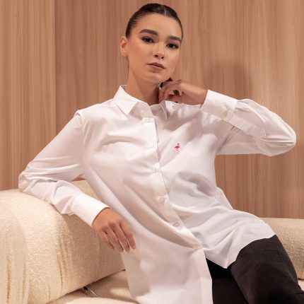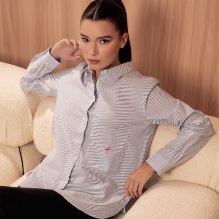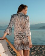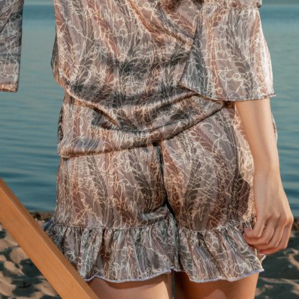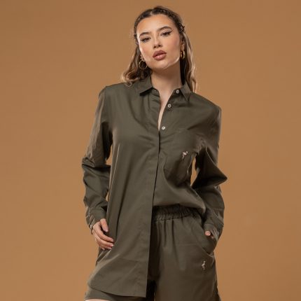 Кошула со маслинест принт, изработена со карнери на ракавите.