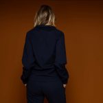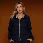 Горна женска тренерка во темно сина боја, изработена со патент и декоративни џебови на предната страна.