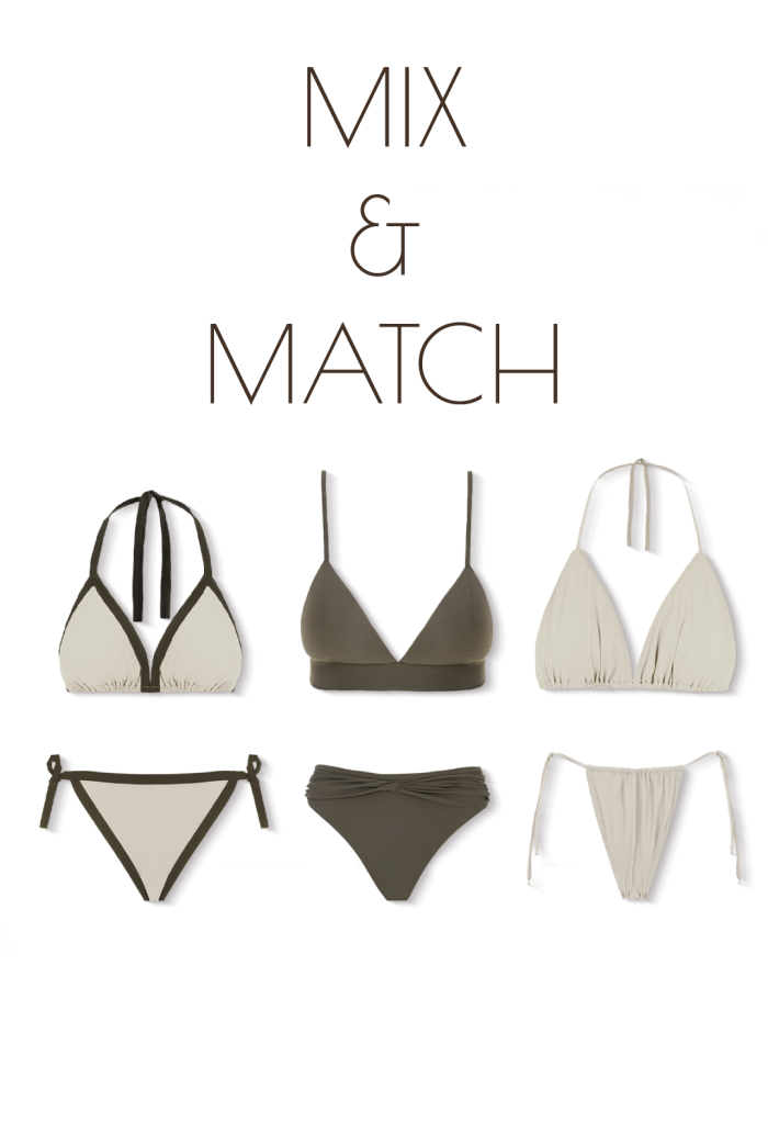 Сет од три дводелни костими за капење што овозможува комбинација на боите и моделите.