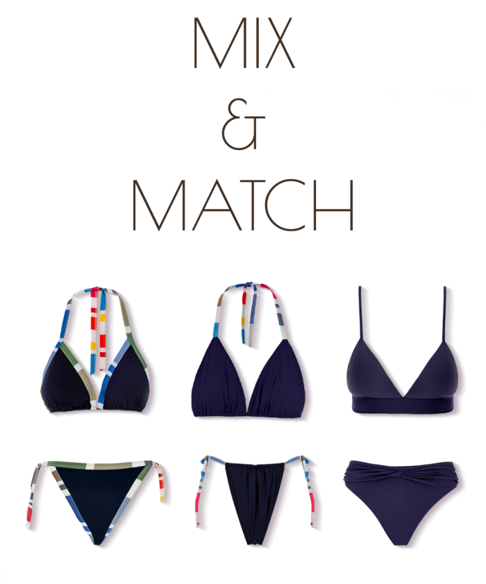 Сет од три дводелни костими за капење што овозможува комбинација на боите и моделите.