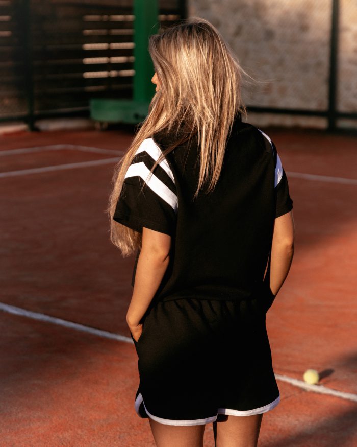Женски бермуди во црна боја, со декоративен бел паспул.