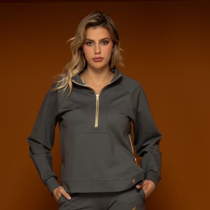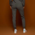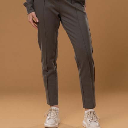 Долни женски тренерки во сиво-маслинеста боја. Моделот е тесен. Изработени се со врвка за врзување и рендер на ногавиците.