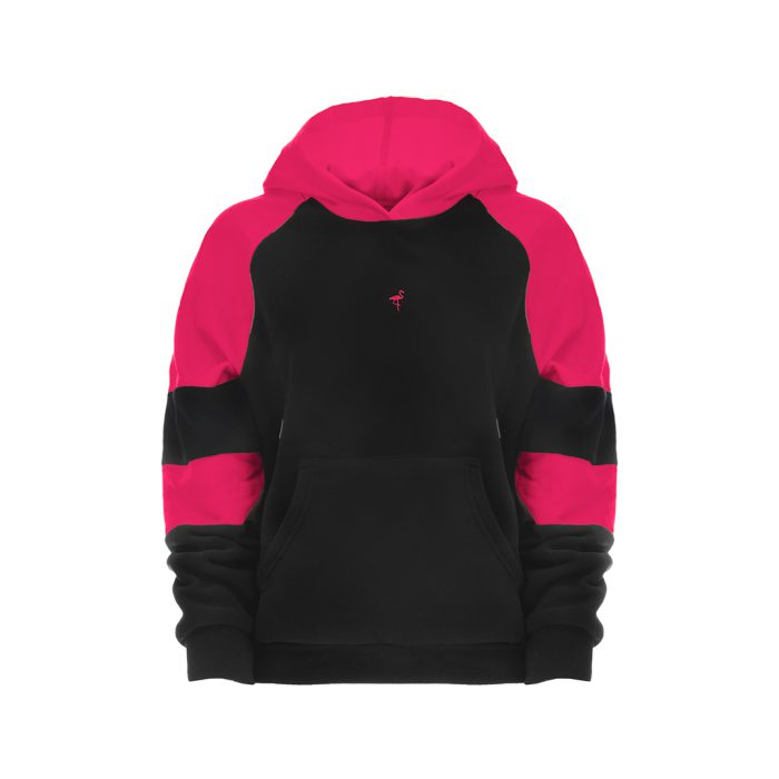 Горната тренерка е изработена со декоративни ракави во розова боја и капа.