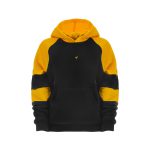Горната тренерка е изработена со декоративни ракави во жолта боја и капа.