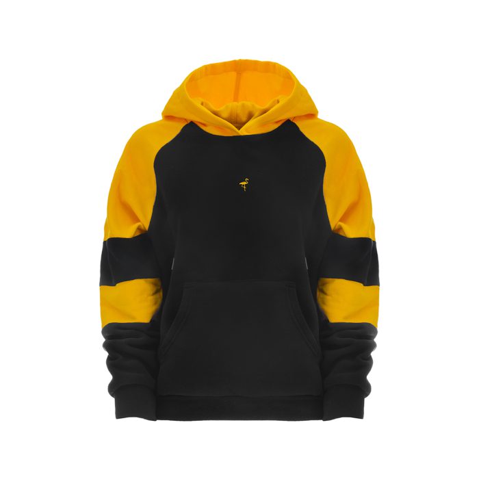Горната тренерка е изработена со декоративни ракави во жолта боја и капа.